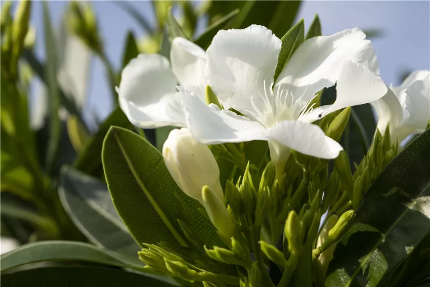 Nerium oleander, weiß Nicht nur durch die Urlaubsreisen sind mediterrane Pflanzen immer beliebter geworden. Inzwischen weiß man, dass man diese Exoten auch ohne großen Aufwand zu Hause gedeihen lassen kann. Daher bieten Gärtnereien und Garten-Zentren eine große Auswahl an verschiedenen mediterranen Pflanzen, die sich auch gut als Kübelpflanzen für die Terrasse eignen. Zu den beliebtesten Vertretern gehören zum Beispiel Bougainvillea, Oleander, Hibiskus, Myrte, Jasmin, Palmlilie, Zittergras, Wandelröschen, Lorbeer, Olivenbäumchen, Feigen, Malven, Kletterrosen, Verbenen, Buchskugeln, Bleiwurz oder Granatapfel, die in Terrakotta-Töpfen jeder Terrasse ein mediterranes Flair geben. Dazu passen optimal Wein und Blauregen als Rankenpflanzen, die in großen Kübeln gepflanzt auf der Terrasse oder dem Balkon in Südlage angenehmen Schatten spenden können.