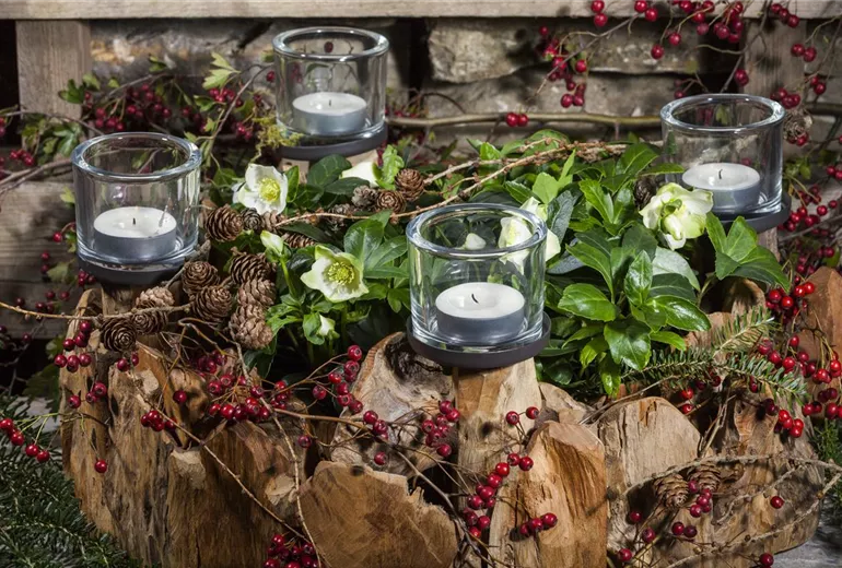 Anstelle des klassisch grünen Adventskranzes kann man auch aus Weinreben, wildem Hopfen oder anderen rankenden Pflanzen einen Kranz binden. Das kann – muss aber nicht – auch ohne einen Rohling geschehen, um dem Kranz eine gewisse Leichtigkeit zu verleihen. Der Phantasie sind hier kaum Grenzen gesetzt, außer dass aus Sicherheitsgründen auf einen guten Stand der Kerzen geachtet werden sollte. Als Kerzen eignen sich dafür zum Beispiel hohe schlanke Tafelkerzen, die in passende kleine Ständer gesteckt werden können. Beim Binden sollte direkt berücksichtigt werden, dass die Kerzenständer später noch standsicher einzuarbeiten sind. Alternativ zu den Tafelkerzen sind mit entsprechenden Steck- oder Klemmhaltern auch Baumkerzen oder Teelichte denkbar. Wer echte Kerzen nicht ständig beaufsichtigen will oder kann, der kann auf Echtwachs LED Adventskranzkerzen ausweichen. Die sind inzwischen sogar mit Flacker-Effekt und Fernbedienung erhältlich.