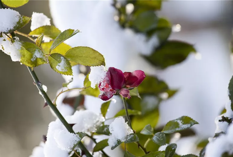 Damit die Rosen im Garten gut durch den Winter kommen, brauchen sie ein bisschen Unterstützung. Diese Unterstützung bekommen sie in Form von einem warmen Mantel und warmen Schuhe. Die warmen Schuhe sind eigentlich eine Schicht Erde, die um die einzelnen Stöcke angehäufelt wird. Zusätzlich kann dann noch Tanne ausgelegt werden, um Stamm und Wurzeln zu schützen. Im Fachhandel gibt es zusätzlich auch noch einen speziellen Rosenschutz, der um den Stamm gewickelt werden kann. Edelrosen können trotz der warmen Füße noch sehr empfindlich sein und bekommen einen zusätzlichen Schutz in Form eines Jutesacks. Der sollte atmungsaktiv sein und kann zusätzlich noch mit Laub gefüllt werden, bevor er über die Krone gezogen wird. Am Stamm wird der Jutesack dann zugebunden und schützt die Rose vor dem kommenden Frost. Wenn im neuen Jahr dann kein Frost mehr zu erwarten ist, kann der Winterschutz wieder entfernt werden und die Rosen freuen sich um Start in die neue Saison über eine ordentliche Portion Dünger in Form von Kompost und ab Mai durch einen speziellen Rosendünger. Abgefrorene Triebe werden entfernt und so sorgen die Rosen auch im neuen Gartenjahr wieder für Romantik.